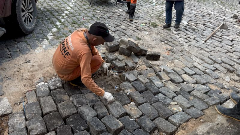 O local apresentava desníveis que dificultavam o estacionamento e a circulação de veículos. As equipes atuaram na recomposição do piso com blocos de pedra natural, técnica tradicional que preserva a identidade histórica da área. As pedras foram assentadas sobre uma base de areia e finalizadas com a chamada “farofa”, mistura de cimento e areia que, ao ser molhada, se transforma em concreto, garantindo durabilidade.