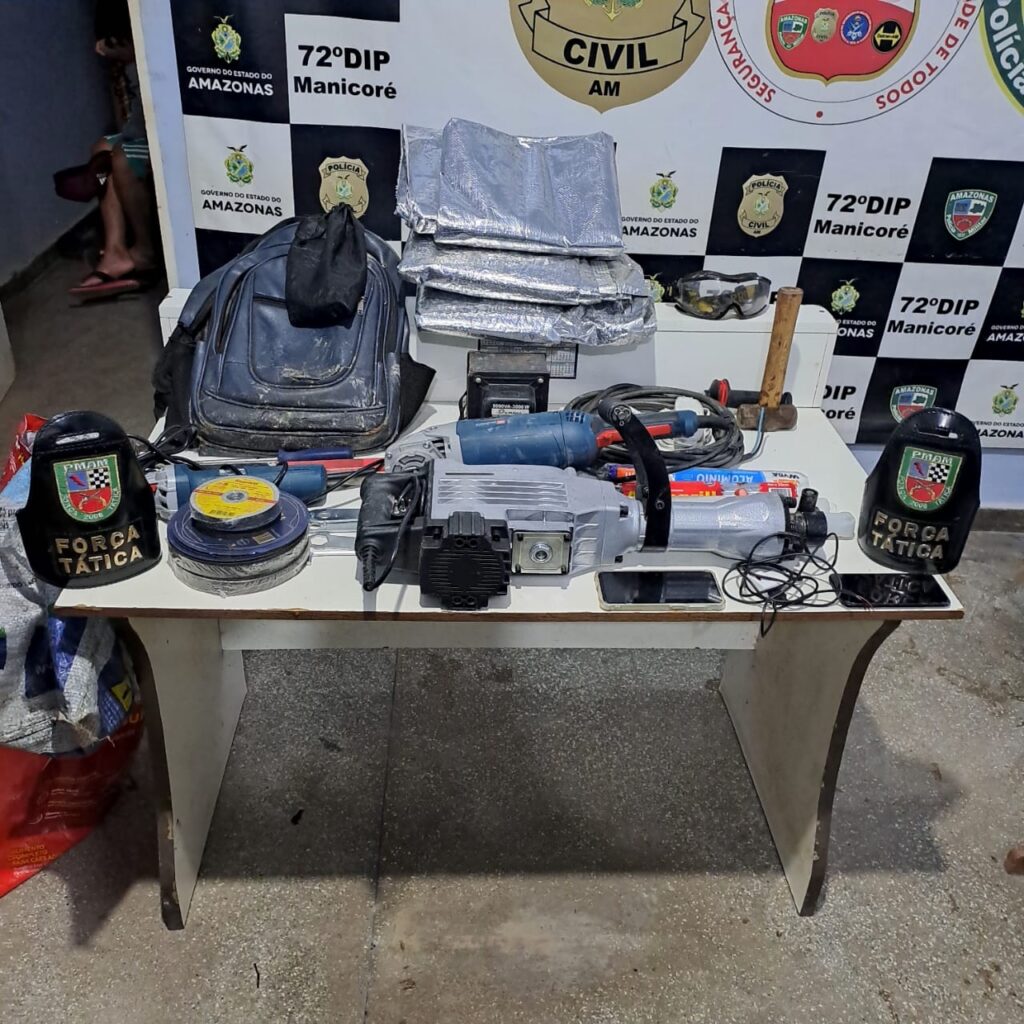 Com os criminosos, foram apreendidos diversos materiais utilizados para o arrombamento, como uma lixadeira elétrica, um martelete elétrico, dois aparelhos celulares, três rolos de manta térmica, dez discos de policorte, uma esmerilhadeira, uma marreta de cabo, um cabo de extensão elétrica, um transformador de energia e dois rolos de papel alumínio. Os equipamentos apreendidos somam um prejuízo estimado em R$ 15 mil para os criminosos.