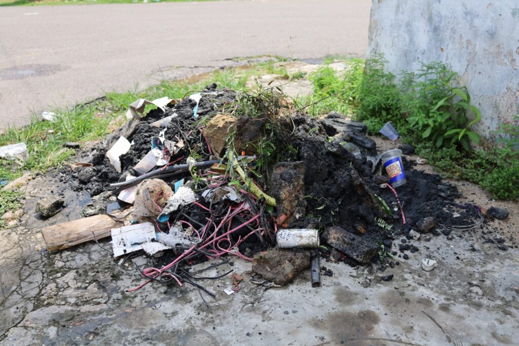 Durante a ação, foram retirados diversos materiais que comprometiam o fluxo adequado das águas pluviais, como garrafas e copos plásticos, latinhas, embalagens e outros objetos descartados de forma irregular em via pública e arrastados para dentro das redes de drenagem. A presença desses resíduos dentro das caixas coletoras impede a passagem da água da chuva e provoca alagamentos, além de acelerar o desgaste da estrutura.