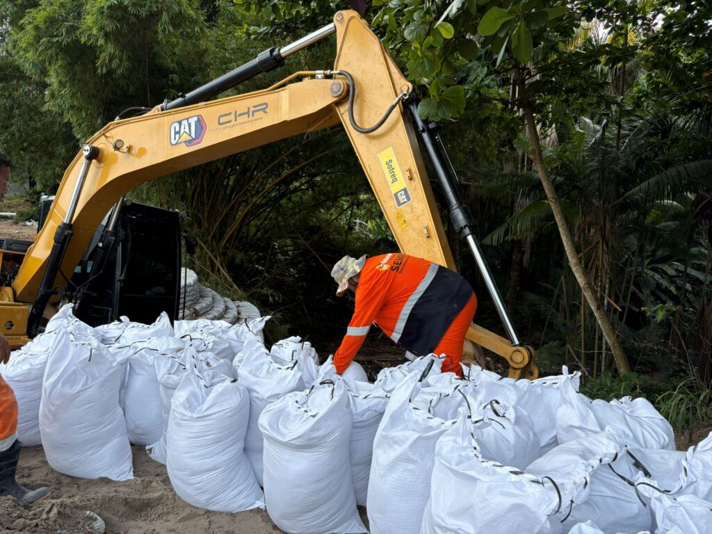 O problema foi provocado por um rompimento na rede de drenagem, que ocasionou uma erosão de aproximadamente seis metros de profundidade. As equipes atuam com a técnica de rip-rap, utilizada para estabilizar o solo e proteger taludes, garantindo maior resistência e durabilidade à área. Ao todo, estão sendo aplicadas mais de 5 mil sacas de material.