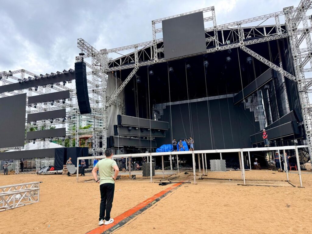 Durante a visita técnica, o prefeito verificou de perto a montagem dos palcos, sistemas de som, iluminação e áreas de apoio que irão receber milhares de pessoas nos dois dias de evento. Na Ponta Negra, a estrutura principal impressiona pela dimensão: o palco possui 70 metros de boca de cena e uma área total de aproximadamente 30 mil metros quadrados, garantindo conforto, visibilidade e segurança ao público.